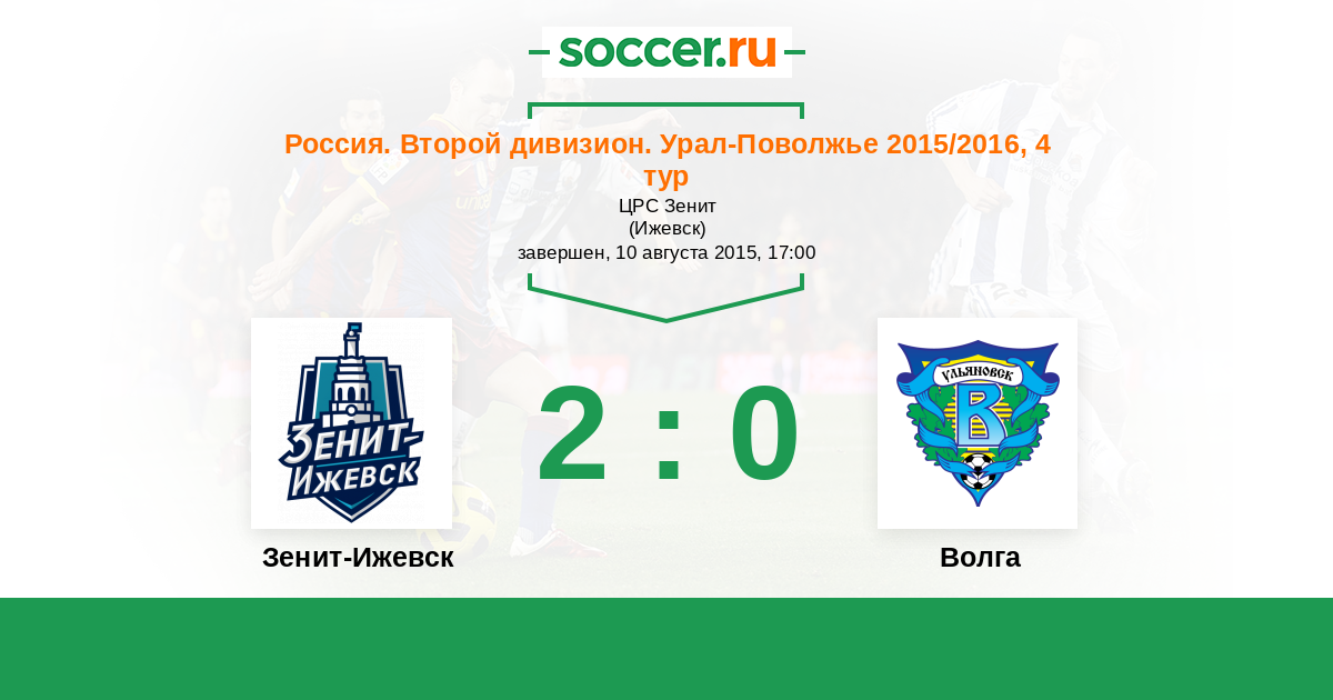 Россия. Вторая лига. Группа 4 27.09.2015 Волга Логотип футбольный клуб Волга (Ульяновск) 2:1 Логотип футбольный клуб Зенит-Ижевск Зенит-Ижевск