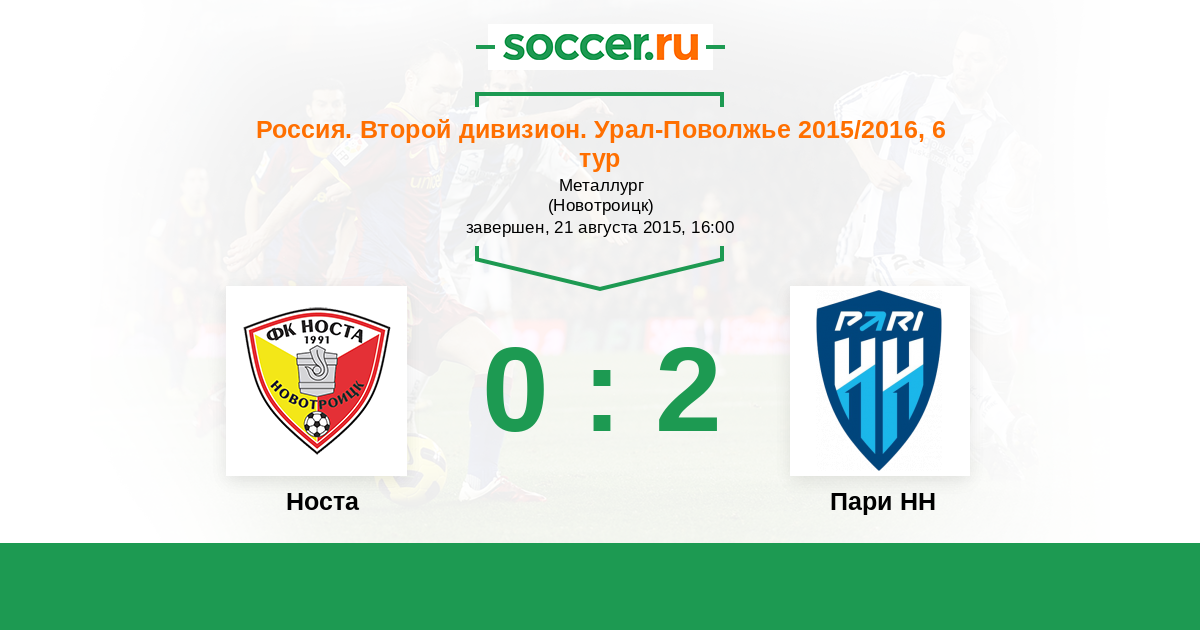 Россия. Вторая лига. Группа 4 08.10.2015 Волга-Олимпиец Логотип футбольный клуб Волга-Олимпиец (Нижний Новгород) 0:2 Логотип футбольный клуб Носта (Новотроицк) Носта