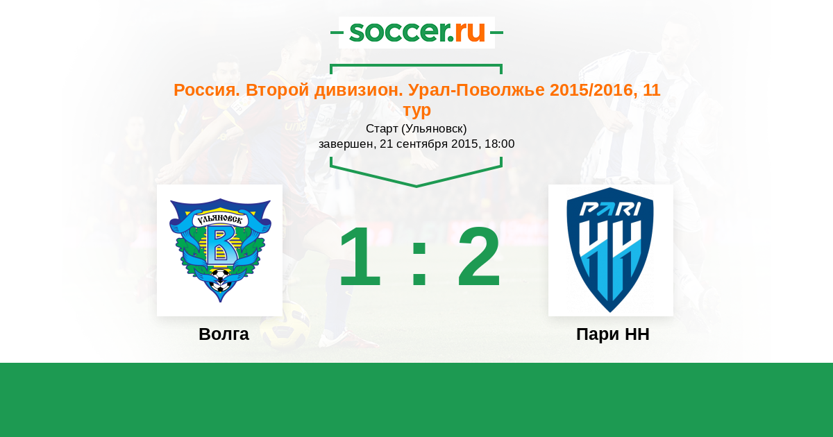 Россия. Вторая лига. Группа 4 09.09.2016 Волга Логотип футбольный клуб Волга (Ульяновск) 1:1 Логотип футбольный клуб Пари НН (Нижний Новгород) Пари НН