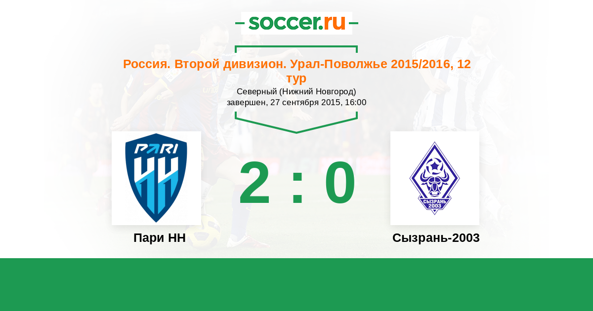 Россия. Вторая лига. Группа 4 04.09.2016 Пари НН Логотип футбольный клуб Пари НН (Нижний Новгород) 2:0 Логотип футбольный клуб Сызрань-2003 Сызрань-2003