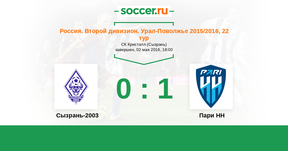 Россия. Вторая лига. Группа 4 04.06.2017 Сызрань-2003 Логотип футбольный клуб Сызрань-2003 0:1 Логотип футбольный клуб Пари НН (Нижний Новгород) Пари НН