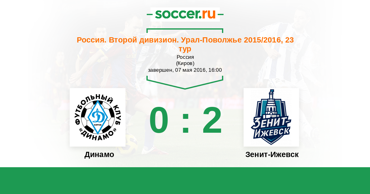 Россия. Вторая лига. Группа 4 24.04.2015 Динамо Киров Логотип футбольный клуб Динамо Киров 1:2 Логотип футбольный клуб Зенит-Ижевск Зенит-Ижевск