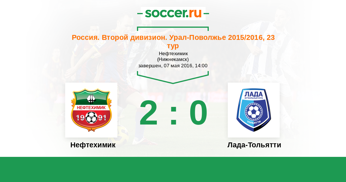 Россия. Вторая лига. Группа 4 24.05.2015 Нефтехимик Логотип футбольный клуб Нефтехимик (Нижнекамск) 1:0 Логотип футбольный клуб Лада-Тольятти Лада-Тольятти