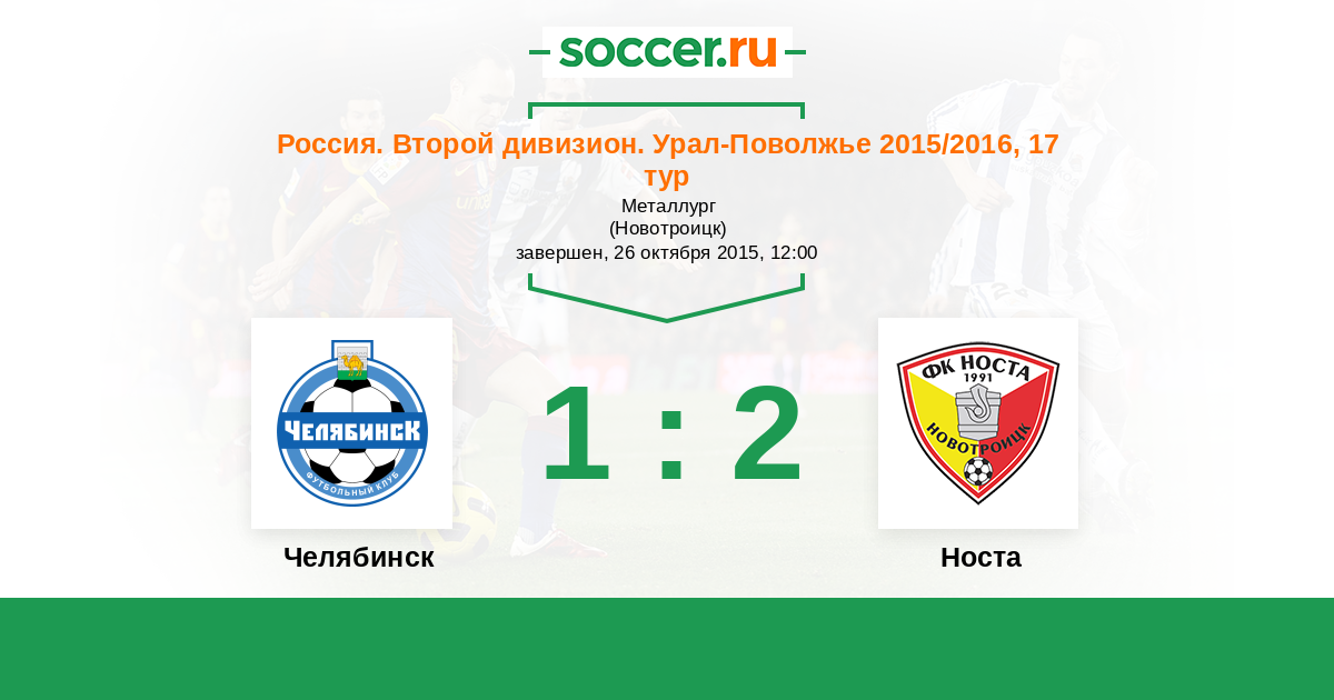 Россия. Вторая лига. Группа 4 09.09.2015 Носта Логотип футбольный клуб Носта (Новотроицк) 0:1 Логотип футбольный клуб Челябинск Челябинск