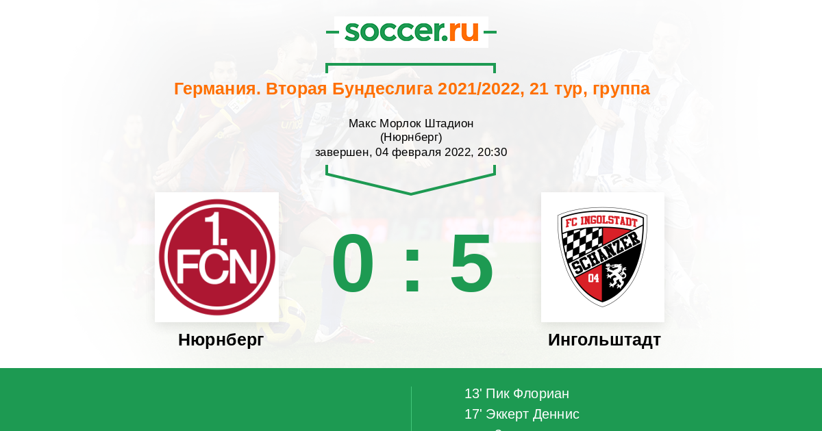 Последняя личная встреча состоялась 8 октября 2021 и она закончилась со счетом 0:7. Общая статистика личных встреч говорит о 17 играх, в которых команда Нюрнберг выиграла в 7 матчах, а вот Ингольштадт обыгрывала грядущего соперника в 5 матчах, еще в 5 играх клубы так и не выявили сильнейшего.
