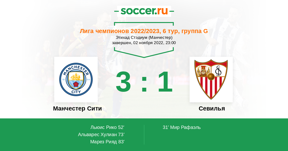 "Сити" тоже преследует "Арсенал", и команде нужно грамотно пользоваться своим ресурсом. Вероятно, эта игра будет не самой голевой и зрелищной. Тем более в этой Лиге чемпионов "Сити" очень мало пропускает — только один мяч. На выезде дважды умудрились сыграть 0:0, а дома пропустили лишь от "Боруссии". Ждём энергосберегающий матч, больше походящий на товарищескую встречу. "Манчестер Сити", скорее всего, обыграет "Севилью" — даже запасные игроки хозяев довольно качественны. Но разгрома, как в их первой встрече в группе (0:4), ожидать не стоит.