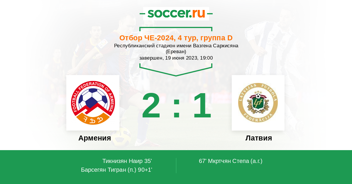 Поздравляю сборную Армении с победой и набиранием трех важных очков,правда игра была нелегкой как многие ожидали.В первом тайме Армения была лучше во втором Латыши играли острее.Было заметно что Армяне поддустали во втором тайме.Без везения здесь не обошлось.