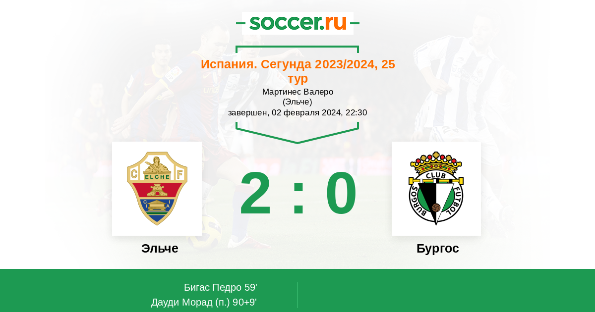 Увлекательный поединок подарит нам 25 тур Сегунды, где «Бургос» приедет в гости к «Эльче». Предлагаем ознакомиться с прогнозами и обзорами ставок на поединок.