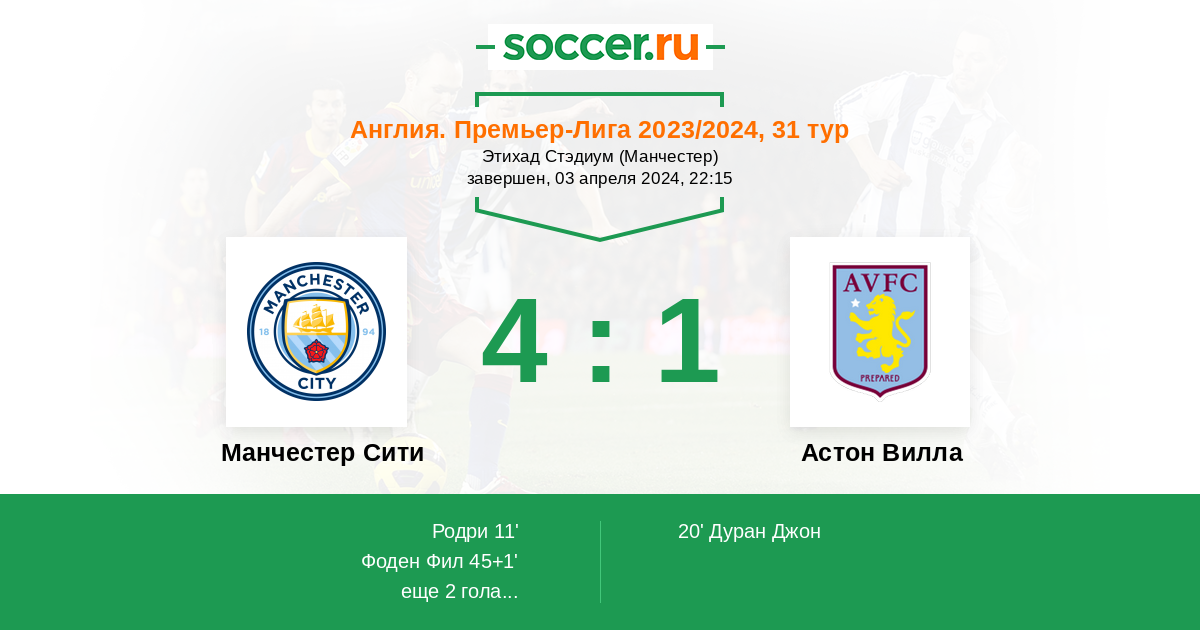 В 31 туре АПЛ «Манчестер Сити» принимает на своем поле «Астон Виллу». Мы предлагаем ознакомиться с прогнозами и обзорами ставок на поединок.