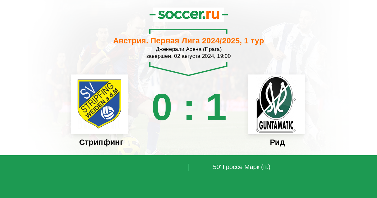 Второго августа в футбольном поединке сойдутся команды "Штрипфинг” и "Рид”. Рекомендуем ознакомиться с представленным прогнозом, а также с доступными ставками.