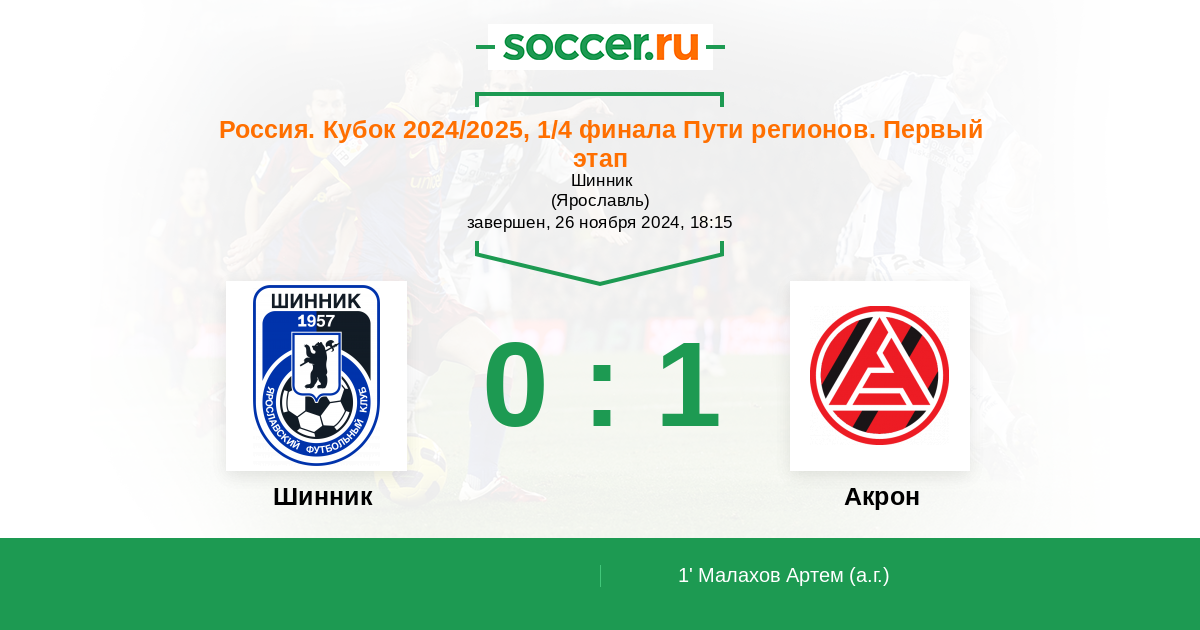 В матче Кубка России Пути регионов между командами Шинник и Акрон смею предположить победу гостей, потому как они играют в более сильной лиге и уже имеют значительный опыт в турнире.