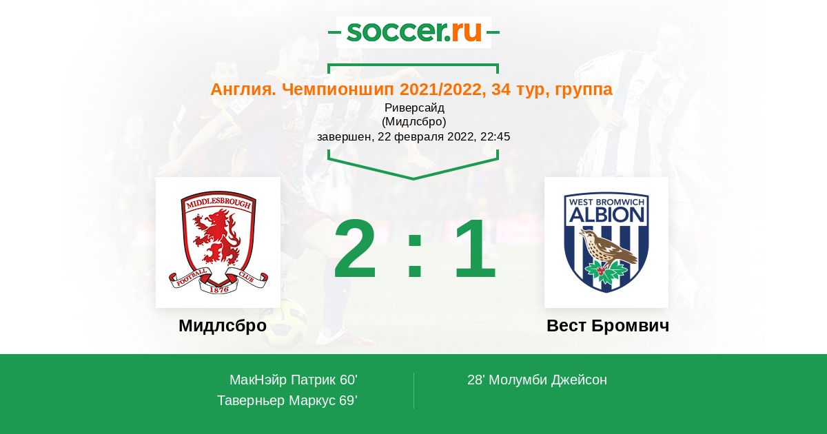 Я думаю что в этом противостоянии более чем явным фаворитом на победу является команда хозяев поля Мидлсбро. Команда хозяев поля довольно неплохо чувствует себя в родных стенах и думаю одержит победу над командой гостей Вест Бромвичем у которой девять поражений в гостевых играх .