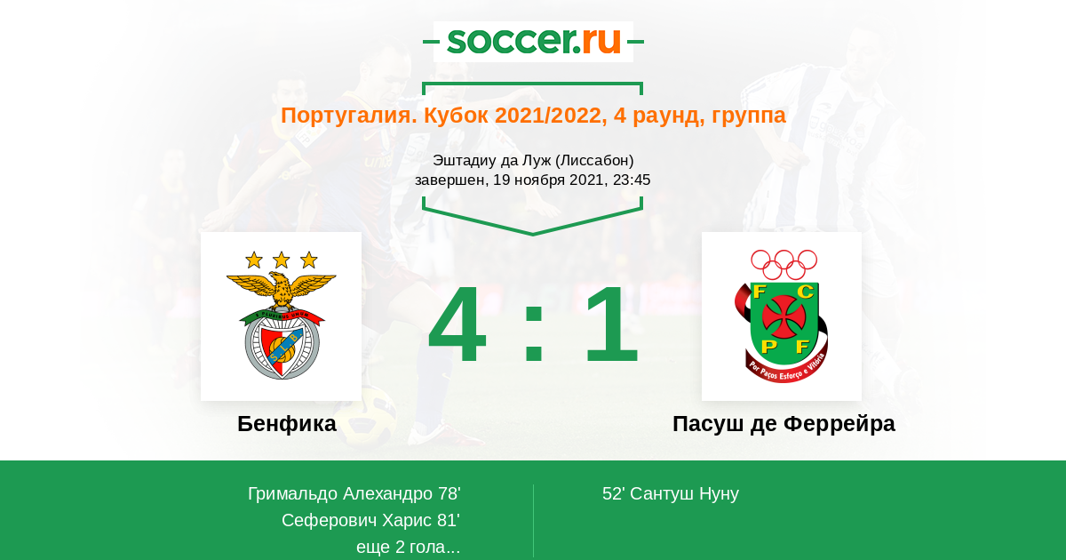 У "Пасуша" проблемы в плане результатов: всего одна победа за последние десять матчей, да и то, в Кубке Португалии над слабым соперником "Агуш Морадал" со счетом 3:0. Перед паузой на сборные "бобры" по делу проиграли "Спортингу" (0:2), перед этим завершили вничью матч с "Маритиму" (0:0). В международном окне "Пасуш" поддержал игровую форму товарищеским матчем с командой третьего дивизиона и победил со счетом 3:1. В Лиссабоне, конечно, будет другая игра, но поскольку у хозяев голова забита другими проблемами, то вряд ли гости проиграют с разницей в два и более мячей.