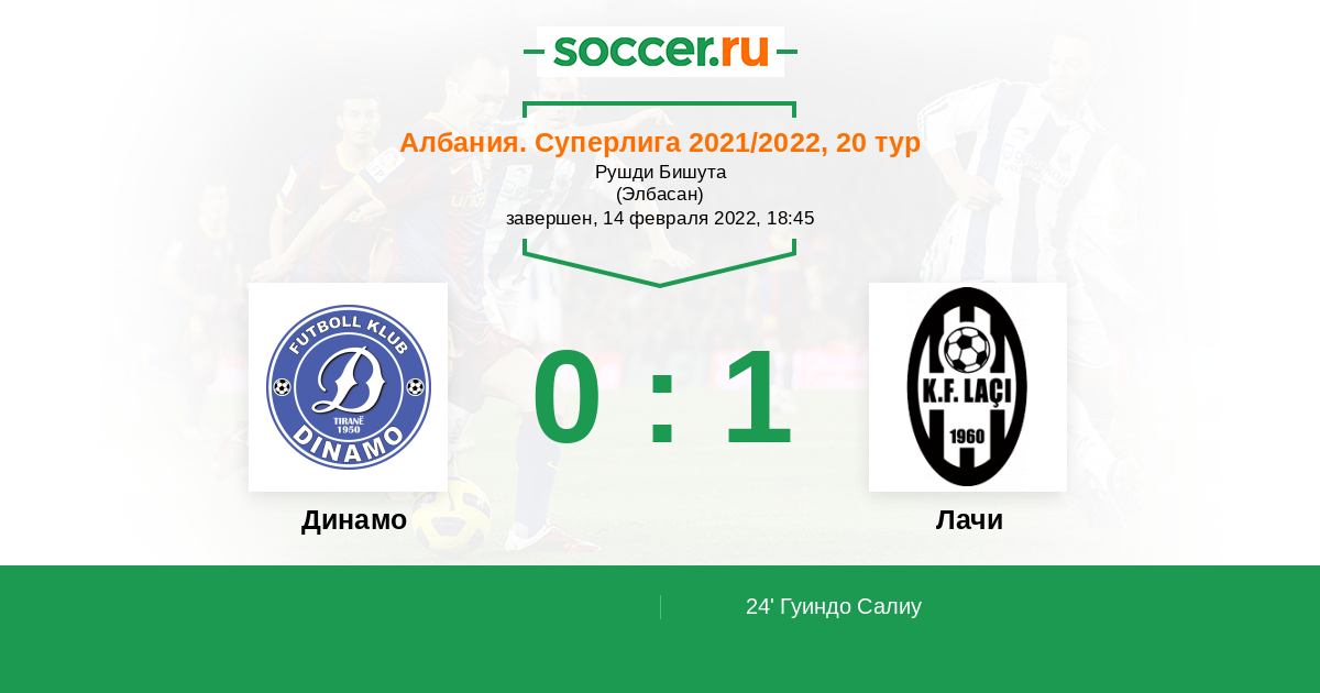 Перед “динамовцами” изначально стояла задача сохранение прописки в элите албанского футбола. На большее клуб из Тирана в нынешнем первенстве рассчитывать не может. Другое дело “Лачи”, который единственный в последнее время сохраняет интригу в чемпионате. В восьми из девяти последних матчах гости праздновали виктории. Считаем, что “динамовцы” не смогут помешать этой победной серии. Можно в этом матче поставить на победу “Лачи”