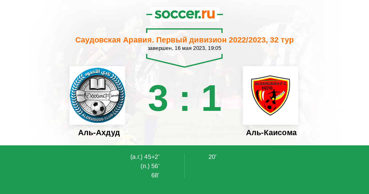 В предстоящем матче 32 - го тура Первого Дивизиона Саудовской Аравии между командами Аль-Ахдуд и Аль-Каисома , фаворитом на победу является команда хозяев Аль-Ахдуд, так как они играют у себя дома.