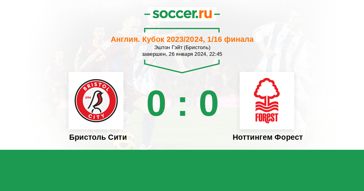 Бристоль Сити - Ноттингем Форест ! Кубковый матч - встречаются команды из разных лиг , но примерно равные по уровню игры . Надеюсь, что амбиции у них возобладают и игра будет в атаку . ТБ .