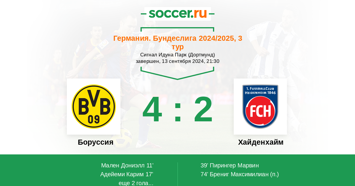 Боруссия - Хайденхайм ! Крайне удачный старт гостей и 0 в графе пропущенных голов , позволяет надеяться , на то , что разгрома от хозяев не стоит ожидать . Ф2 ( +1 ) .