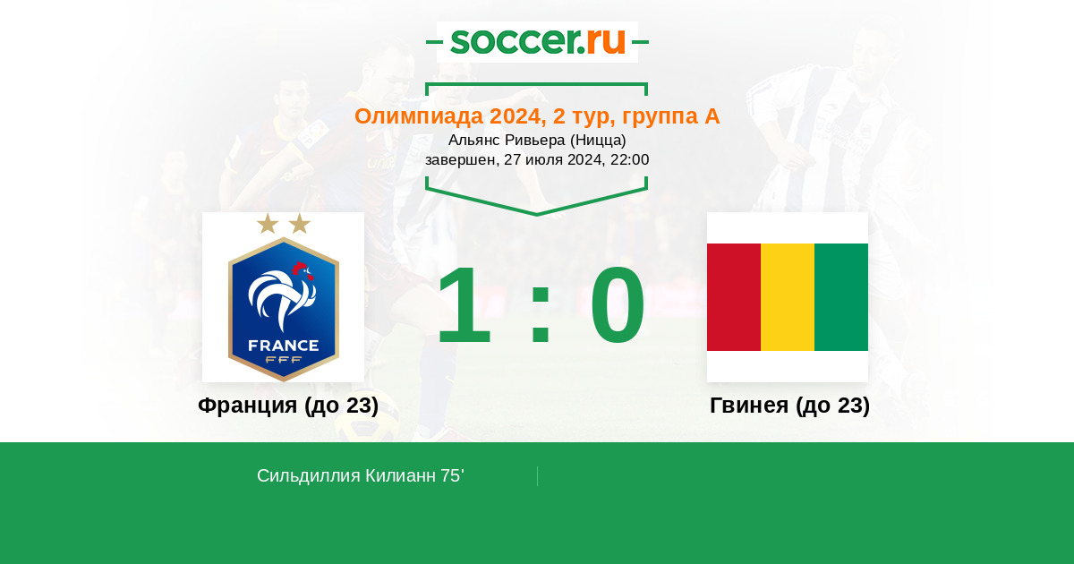 Франция ( до 23 ) - Гвинея ( до 23 ) ! У французов хорошее настроение , в дебютном матче были разгромлены американцы , Этим благодушием и расслабленностью вполне могут воспользоваться африканцы и забьют .