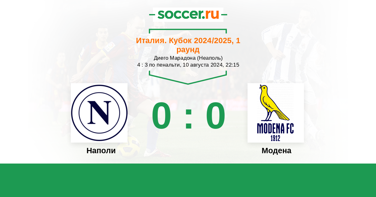 Наполи - Модена ! Кубок это часто интересные матчи с сюрпризами . Начало сезона - сделаю ставку на некоторую расслабленность Неаполя и настрой соперника . Рискну предположить , что обе забьют . ОЗ.