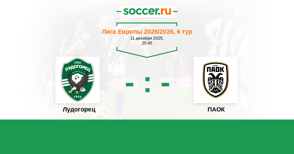 Лудогорец - ПАОК ! Оба клуба довольно мотивированны в этом матче . Хозяева стремятся попасть в " переходные матчи " , ну а гости там закрепится . Результативность у клубов не плохая . ТБ .