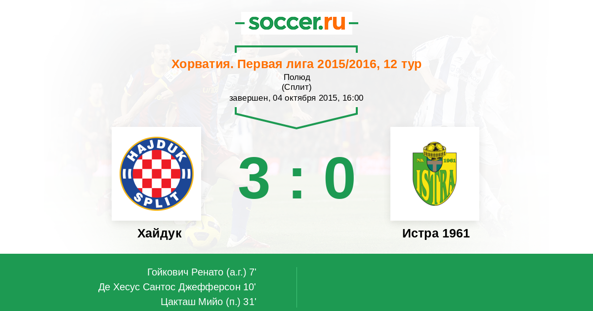 Хорватия. Первая лига 26.07.2015 Истра 1961 Логотип футбольный клуб Истра 1961 (Пула) 4:1 Логотип футбольный клуб Хайдук (Сплит) Хайдук