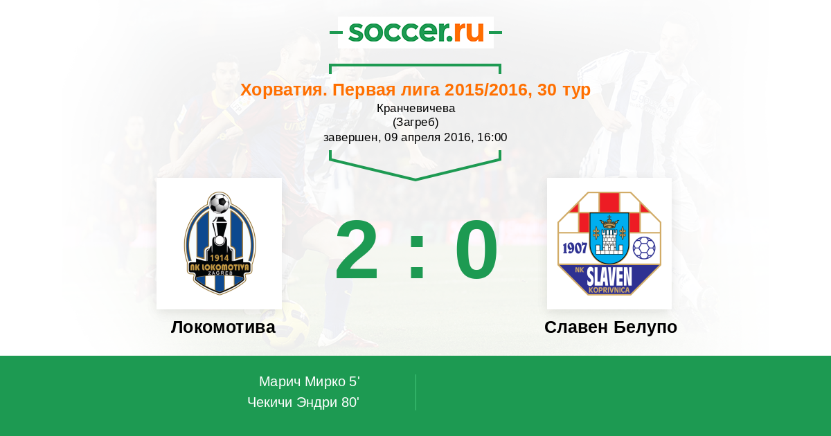Хорватия. Первая лига 15.04.2018 Локомотива Логотип футбольный клуб Локомотива (Загреб) 5:2 Логотип футбольный клуб Славен Белупо (Копривница) Славен Белупо