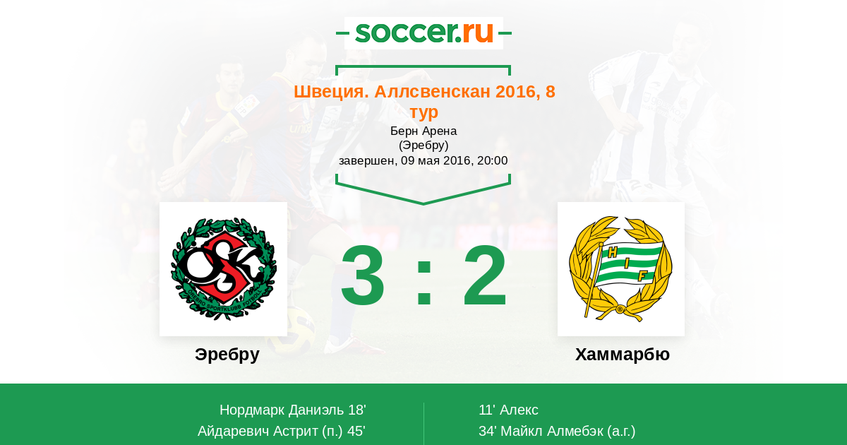 Швеция. Аллсвенскан 13.05.2018 Эребру Логотип футбольный клуб Эребру 1:2 Логотип футбольный клуб Хаммарбю (Стокгольм) Хаммарбю