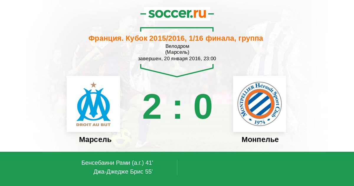 Франция. Лига 1 02.02.2016 Монпелье Логотип футбольный клуб Монпелье 0:1 Логотип футбольный клуб Марсель Марсель