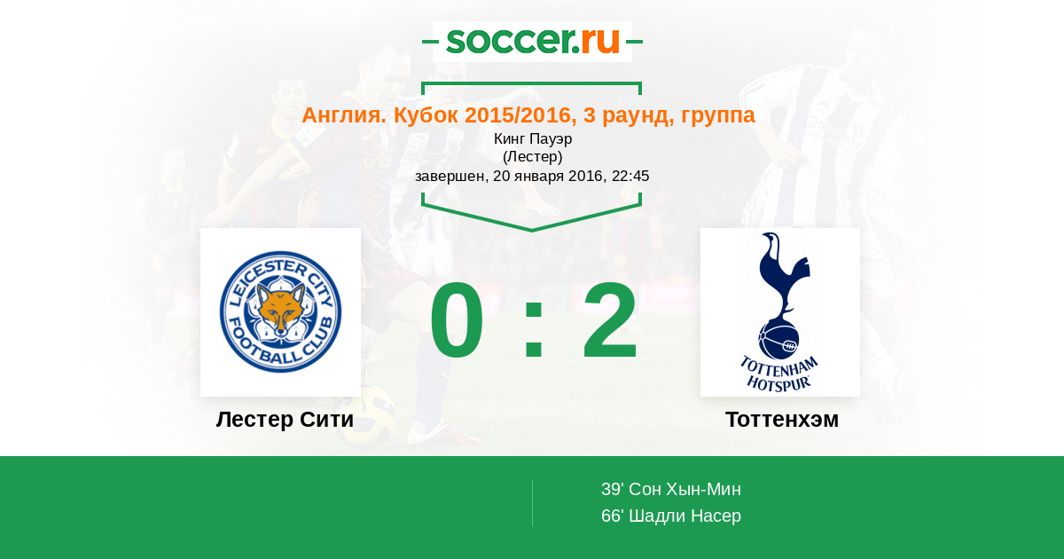 Англия. Кубок 10.01.2016 Тоттенхэм Логотип футбольный клуб Тоттенхэм (Лондон) 2:2 Логотип футбольный клуб Лестер Сити Лестер Сити
