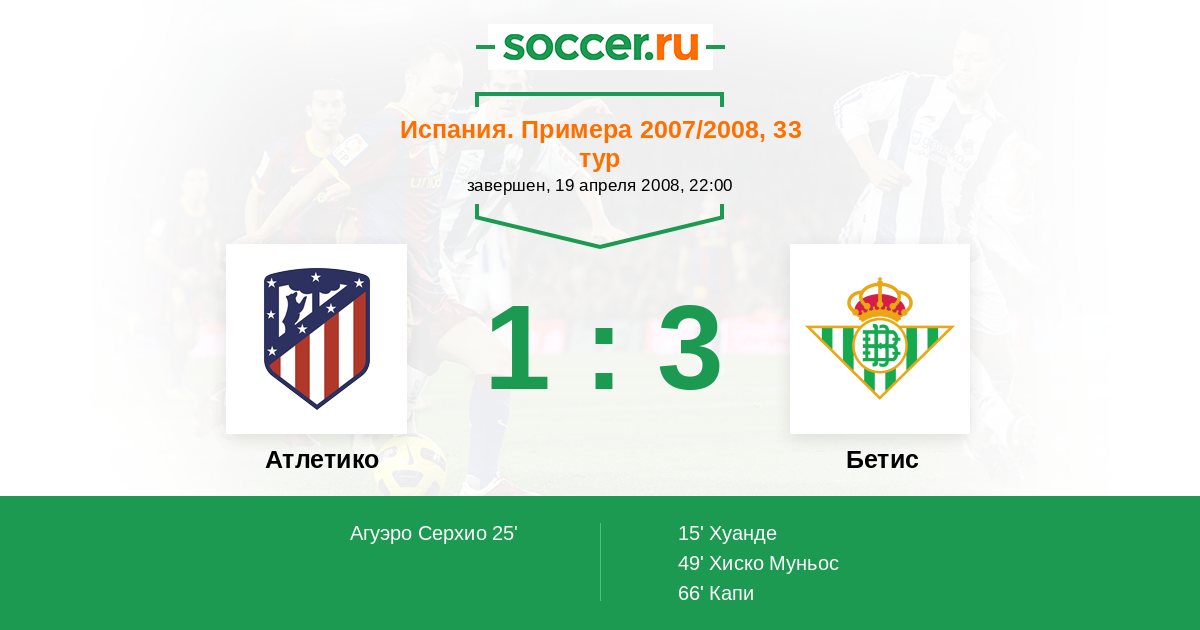 Испания. Примера 28.04.2007 Атлетико Логотип футбольный клуб Атлетико (Мадрид) 0:0 Логотип футбольный клуб Бетис (Севилья) Бетис