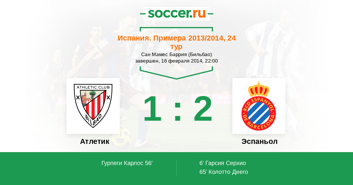 Испания. Примера 10.02.2013 Атлетик Логотип футбольный клуб Атлетик (Бильбао) 0:4 Логотип футбольный клуб Эспаньол (Барселона) Эспаньол