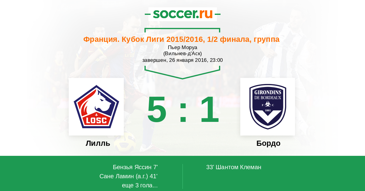 Франция. Лига 1 16.01.2016 Бордо Логотип футбольный клуб Бордо 1:0 Логотип футбольный клуб Лилль Лилль