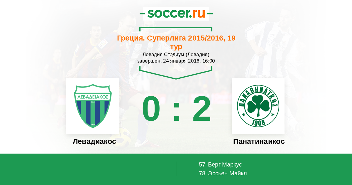 Греция. Суперлига 14.01.2015 Панатинаикос Логотип футбольный клуб Панатинаикос (Афины) 1:0 Логотип футбольный клуб Левадиакос (Левадия) Левадиакос