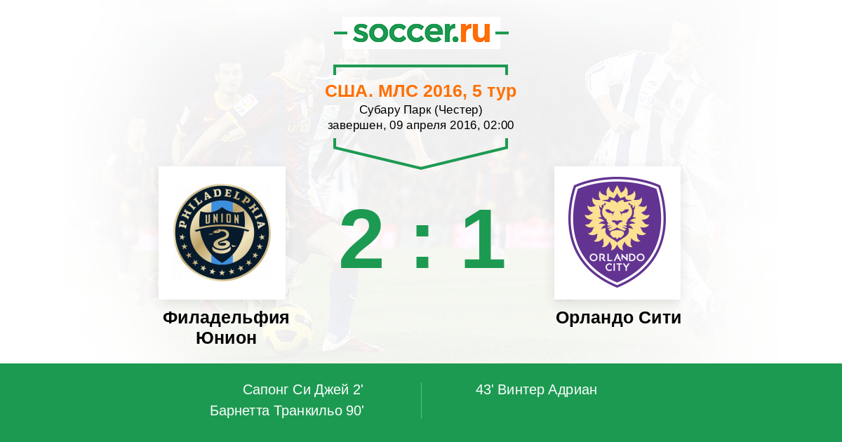США. МЛС 26.05.2016 Орландо Сити Логотип футбольный клуб Орландо Сити 2:2 Логотип футбольный клуб Филадельфия Юнион Филадельфия Юнион