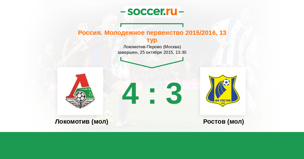 Россия. Премьер-Лига U21 23.09.2016 Ростов (мол) Логотип футбольный клуб Ростов (мол) (Ростов-на-Дону) 0:4 Логотип футбольный клуб Локомотив (мол) (Москва) Локомотив (мол)