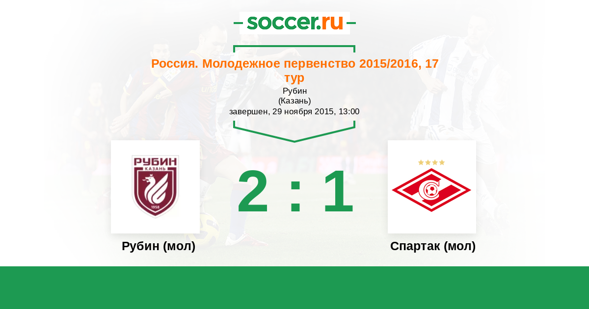 Россия. Премьер-Лига U21 15.10.2011 Рубин (мол) Логотип футбольный клуб Рубин (мол) (Казань) 1:1 Логотип футбольный клуб Спартак (мол) (Москва) Спартак (мол)