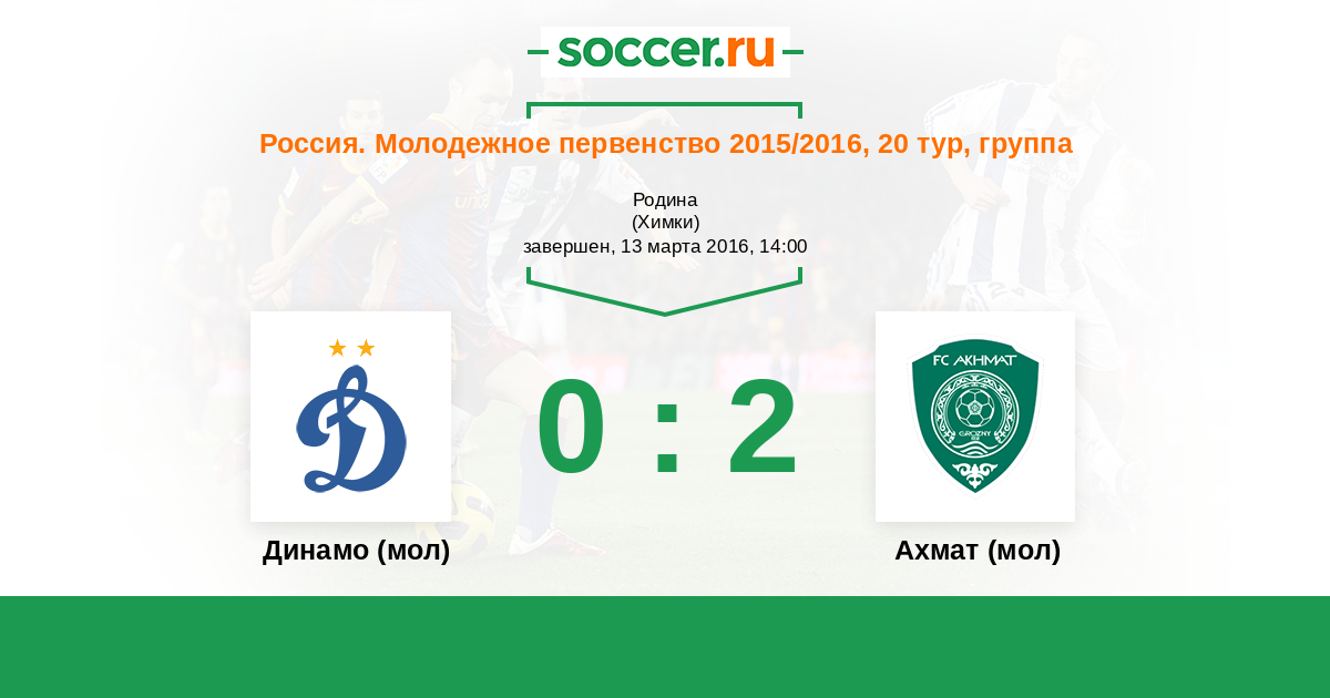 Россия. Премьер-Лига U21 13.03.2020 Ахмат (мол) Логотип футбольный клуб Ахмат (мол) (Грозный) 2:1 Логотип футбольный клуб Динамо (мол) (Москва) Динамо (мол)