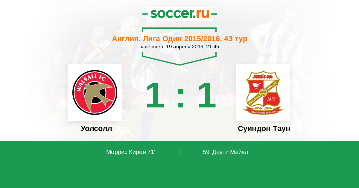 Англия. Первая Футбольная Лига 17.04.2017 Уолсолл Логотип футбольный клуб Уолсолл 1:0 Логотип футбольный клуб Суиндон Таун Суиндон Таун