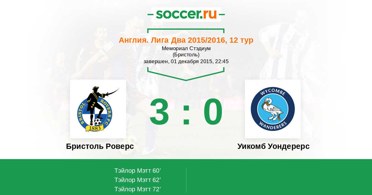 Англия. Вторая Футбольная Лига 16.02.2013 Бристоль Роверс Логотип футбольный клуб Бристоль Роверс 1:0 Логотип футбольный клуб Уикомб Уондерерс (Хай-Вайкомб) Уикомб Уондерерс