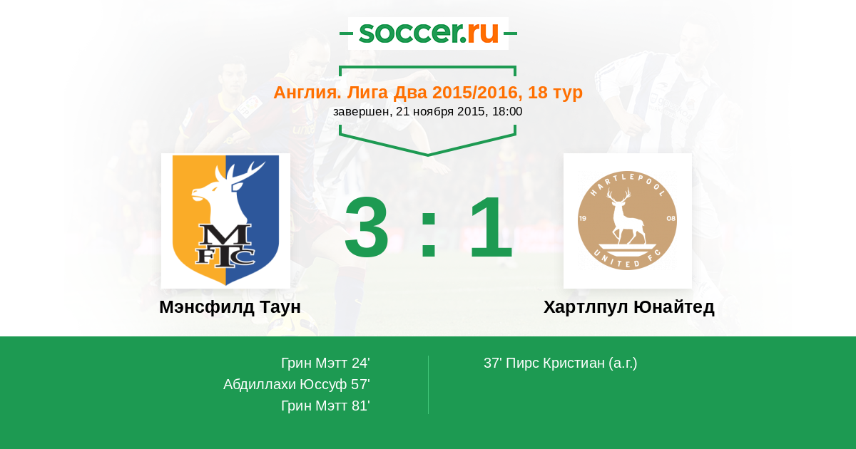 Англия. Вторая Футбольная Лига 26.12.2014 Мэнсфилд Таун Логотип футбольный клуб Мэнсфилд Таун 1:1 Логотип футбольный клуб Хартлпул Юнайтед Хартлпул Юнайтед