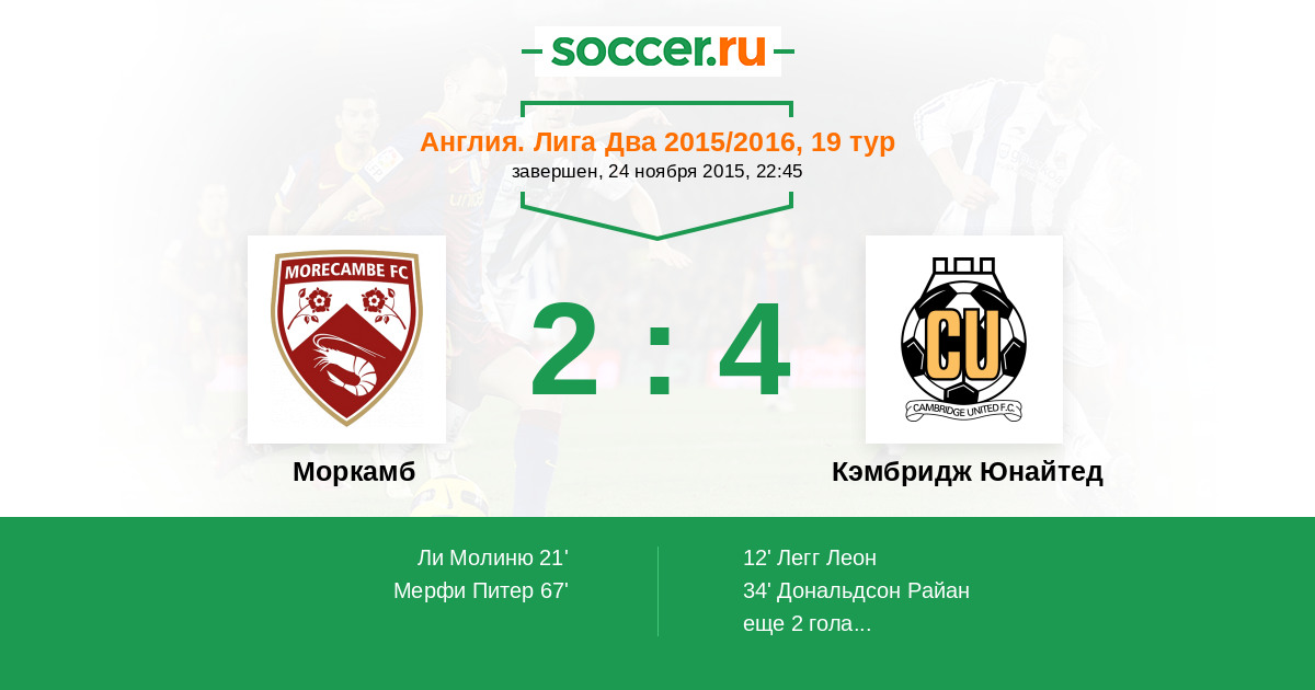 Англия. Первая Футбольная Лига 02.11.2021 Моркамб Логотип футбольный клуб Моркамб 0:2 Логотип футбольный клуб Кэмбридж Юнайтед Кэмбридж Юнайтед