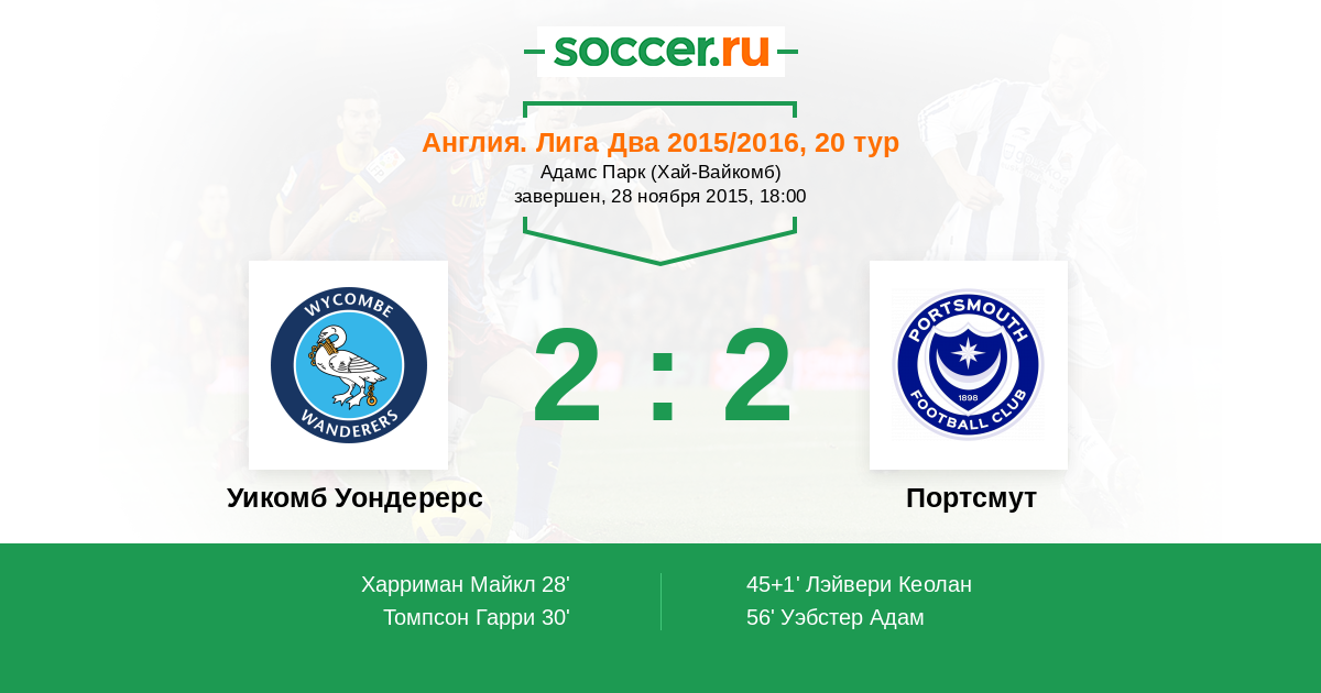 Англия. Вторая Футбольная Лига 23.04.2016 Портсмут Логотип футбольный клуб Портсмут 2:1 Логотип футбольный клуб Уикомб Уондерерс (Хай-Вайкомб) Уикомб Уондерерс