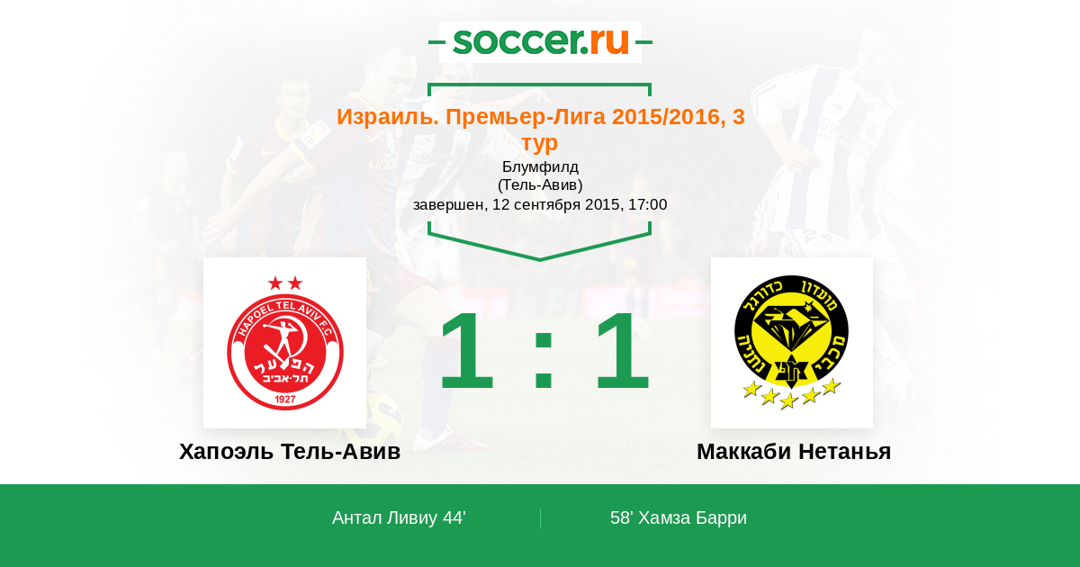 Израиль. Премьер-Лига 10.04.2016 Маккаби Нетанья Логотип футбольный клуб Маккаби Нетанья 0:1 Логотип футбольный клуб Хапоэль Тель-Авив Хапоэль Тель-Авив