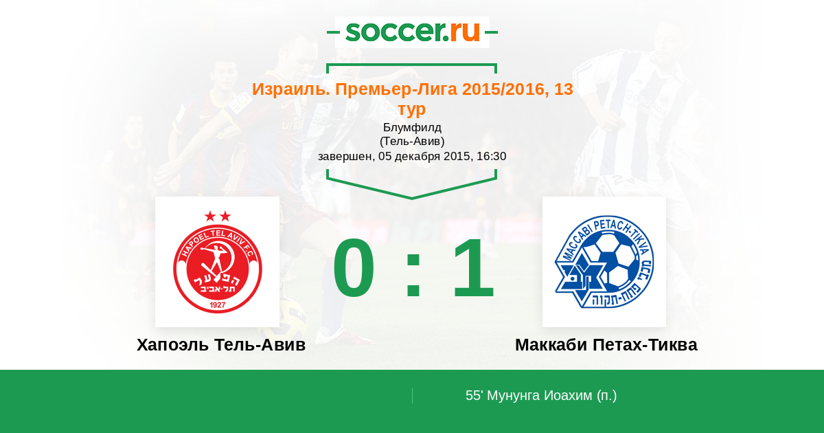 Израиль. Премьер-Лига 05.03.2016 Маккаби Петах-Тиква Логотип футбольный клуб Маккаби Петах-Тиква 1:1 Логотип футбольный клуб Хапоэль Тель-Авив Хапоэль Тель-Авив