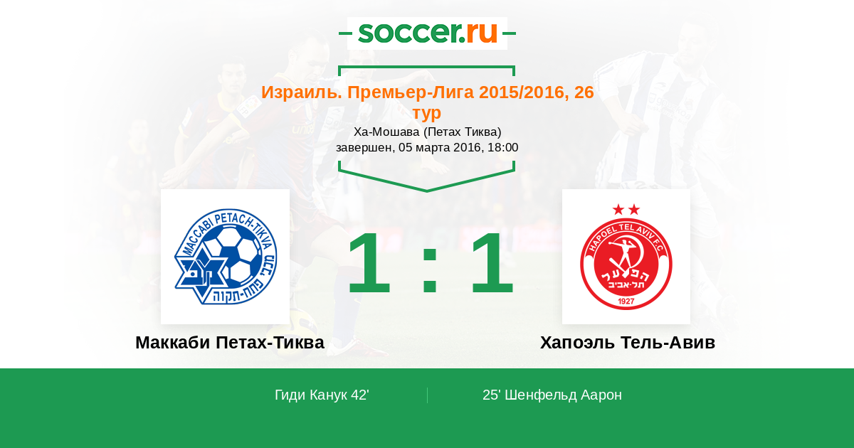 Израиль. Премьер-Лига 14.03.2015 Маккаби Петах-Тиква Логотип футбольный клуб Маккаби Петах-Тиква 2:1 Логотип футбольный клуб Хапоэль Тель-Авив Хапоэль Тель-Авив