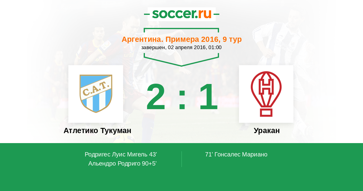 Аргентина. Суперлига 07.04.2019 Уракан Логотип футбольный клуб Уракан (Буэнос-Айрес) 2:0 Логотип футбольный клуб Атлетико Тукуман (Сан-Мигель-де-Тукуман) Атлетико Тукуман