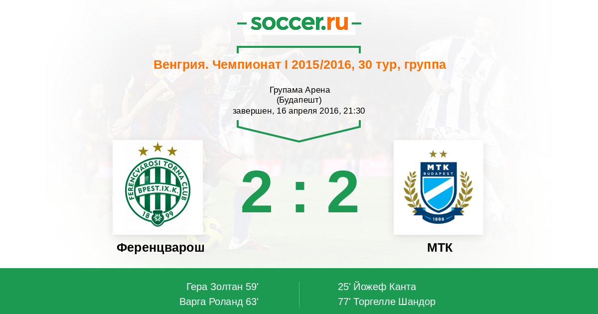 Венгрия. Чемпионат 1 22.03.2015 Ференцварош Логотип футбольный клуб Ференцварош (Будапешт) 2:0 Логотип футбольный клуб МТК (Будапешт) МТК