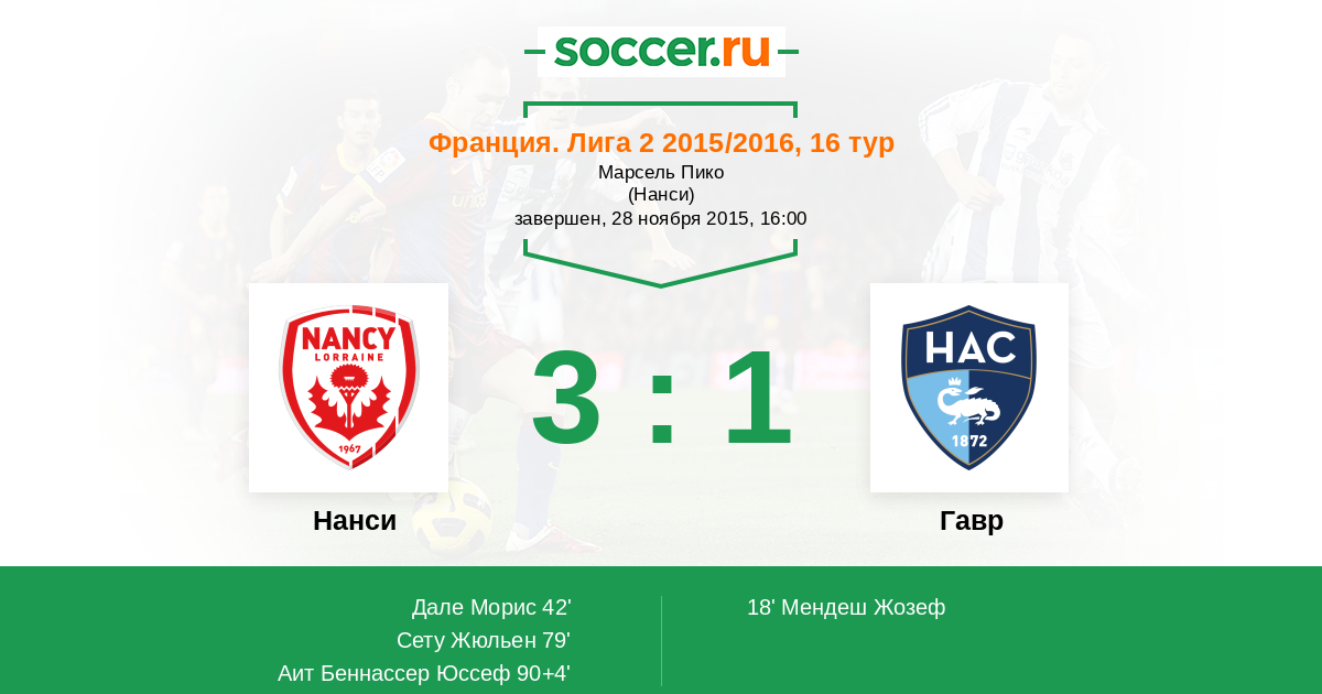 Франция. Лига 2 03.04.2015 Гавр Логотип футбольный клуб Гавр 0:1 Логотип футбольный клуб Нанси Нанси