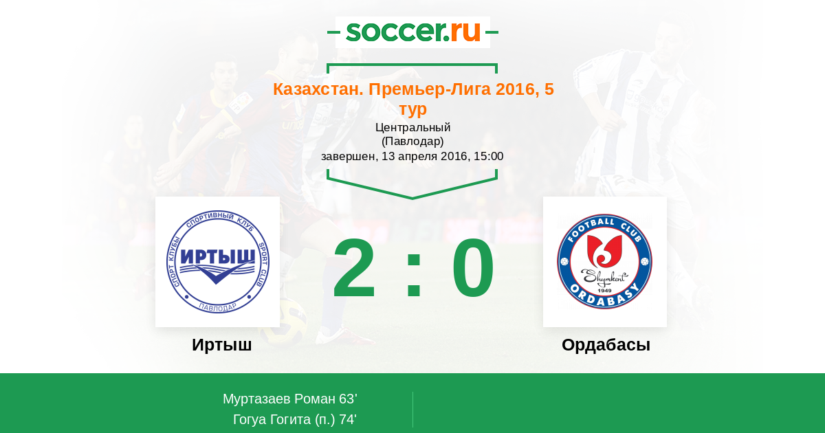 Казахстан. Премьер-лига 11.06.2016 Ордабасы Логотип футбольный клуб Ордабасы (Шымкент) 2:0 Логотип футбольный клуб Иртыш (Павлодар) Иртыш