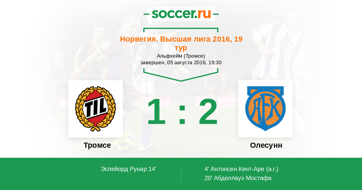 Норвегия. Высшая лига 20.08.2017 Тромсе Логотип футбольный клуб Тромсе 3:2 Логотип футбольный клуб Олесунн Олесунн